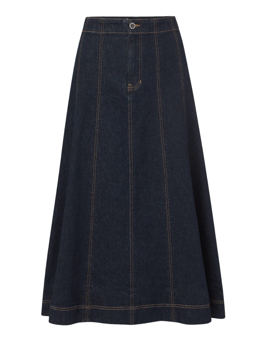 The denim skirt—perfected. Made in LA from dark-blue Italian stretch denim, the Alix circle skirt sits high on the waist and falls to a midi length with fluid movement. All-over contrast seams create a paneled effect, while a wide hem that hits just above the ankle adds extra swing. A seasonless staple, pair it with slingback heels for an elevated finish or tall boots for a more layered look.