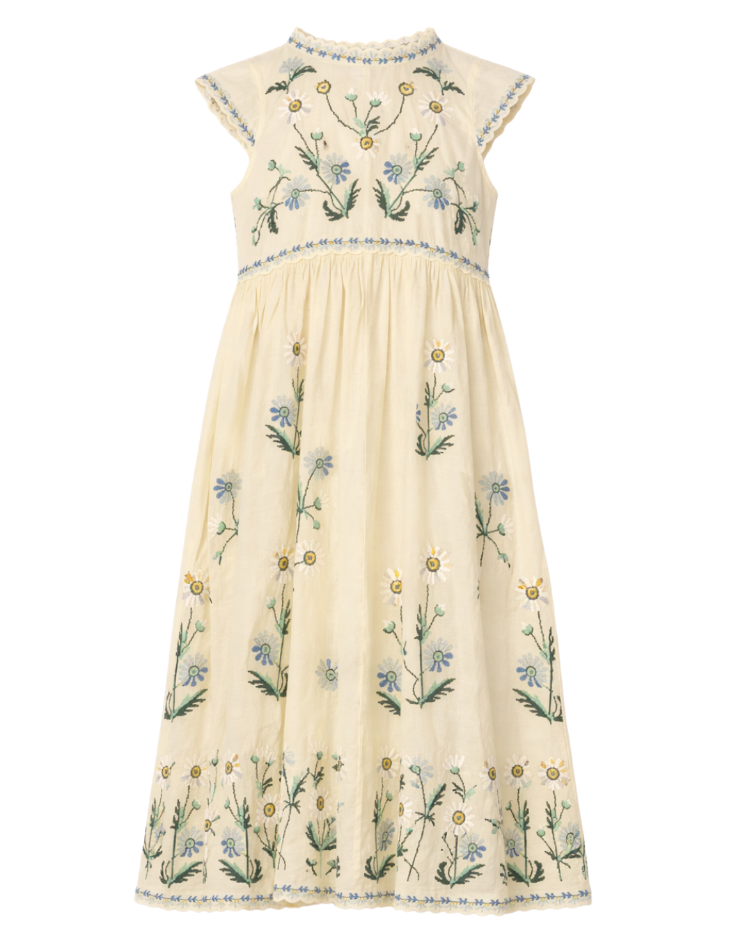 The Audra embroidered dress features a high neckline, cap sleeves, and a flattering midi silhouette. Detailed with scalloped edges and intricate floral embroidery throughout, it is designed for an easy, relaxed fit that feels effortlessly feminine.