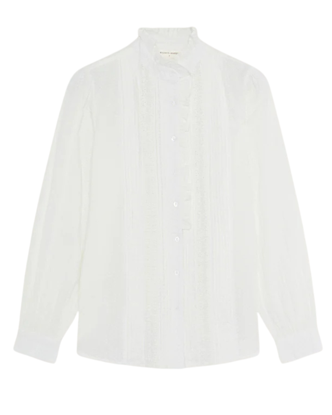 Crafted in soft cotton dobby with shiffly, the Bella Blouse brings a subtle play of textures with delicate pin-tucks and ruffle detailing along the front.