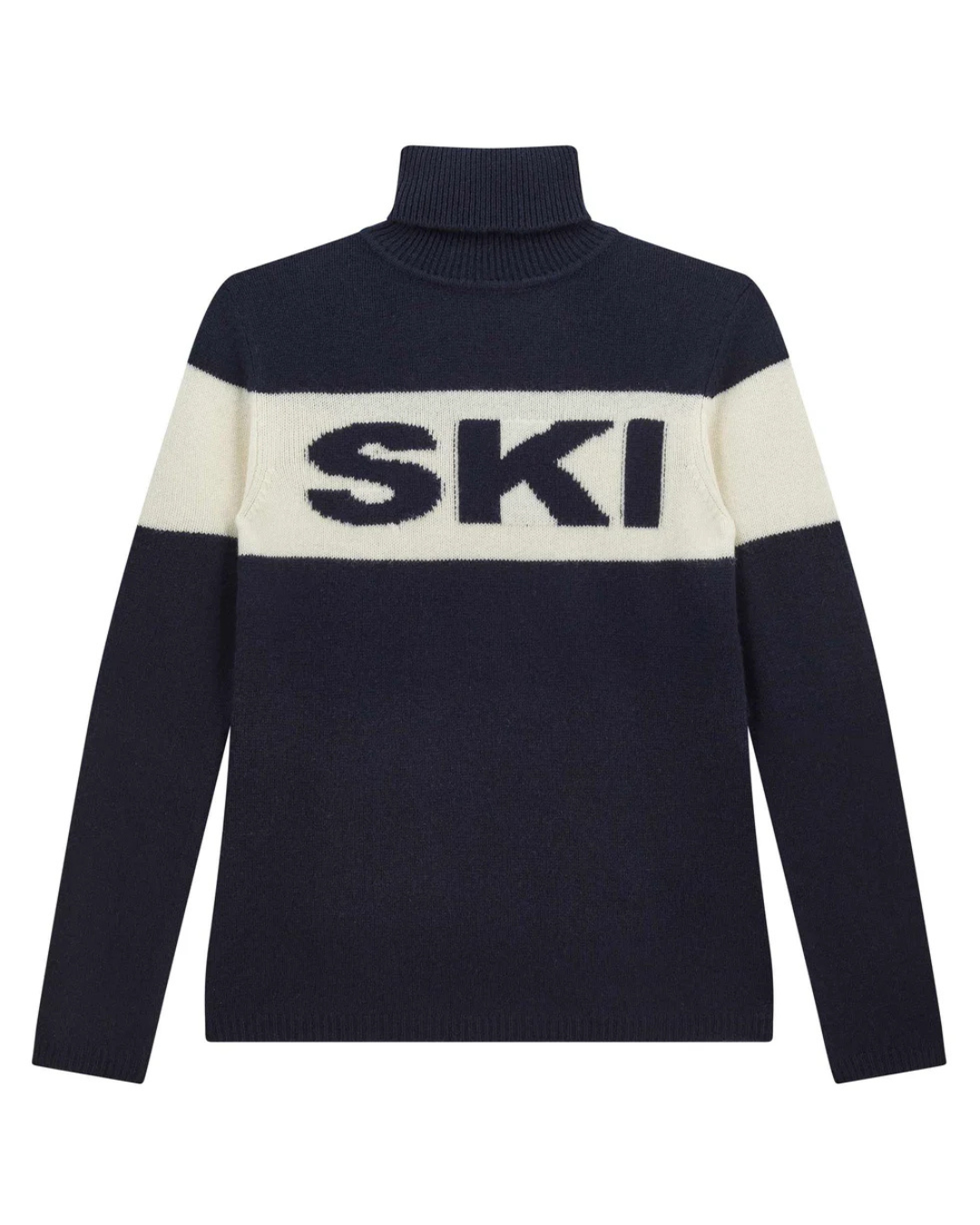 Jumper 1234 cashmere jumper. Navy heavier weight cashmere roll neck jumper with a cream stripe and navy SKI jacquard.