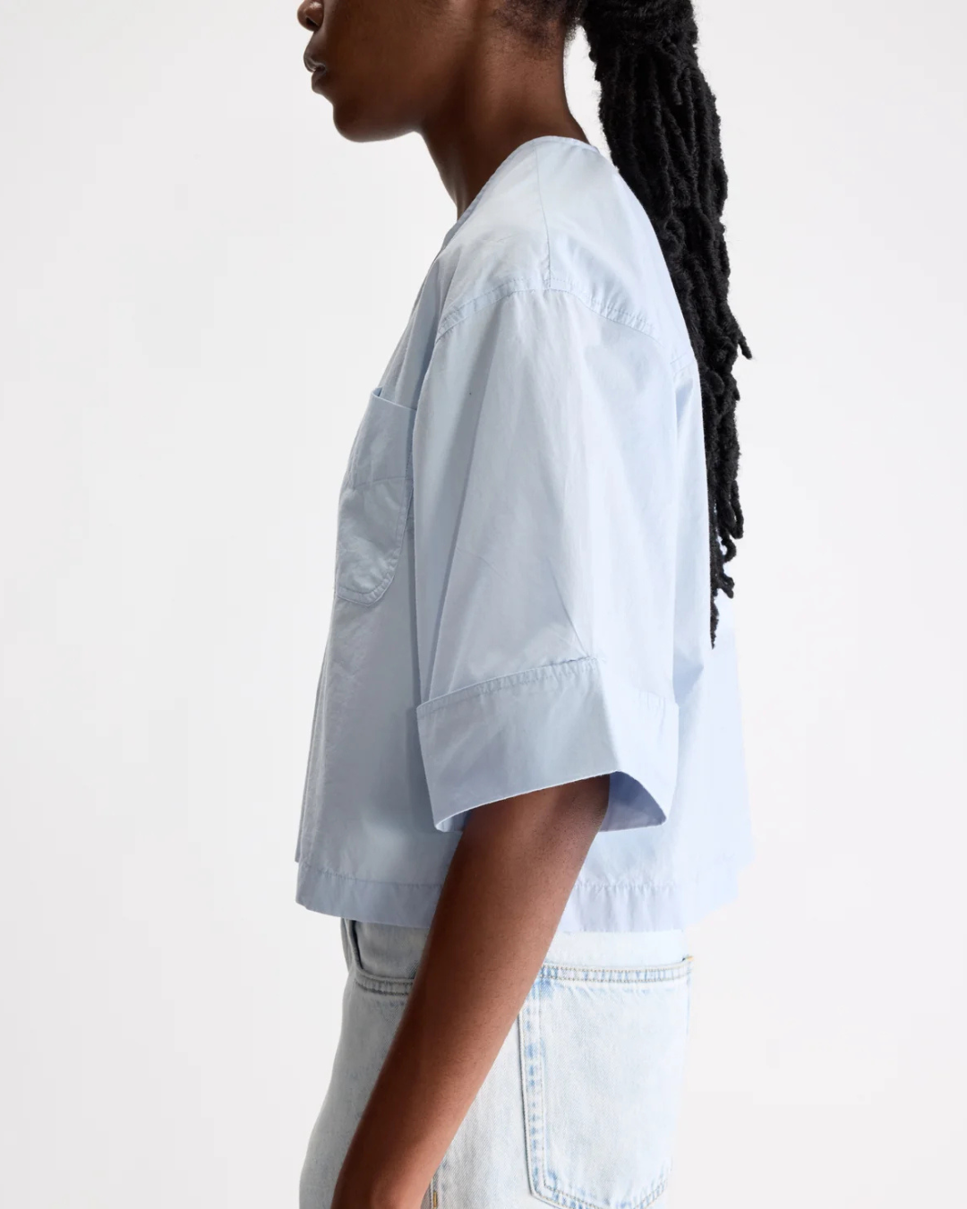 Effortlessly chic and perfectly cropped, this top is crafted from soft, breathable fabric for all-day comfort. Featuring a classic v neckline and short sleeves, this top is elevated with two functional breast pockets for subtle detail.