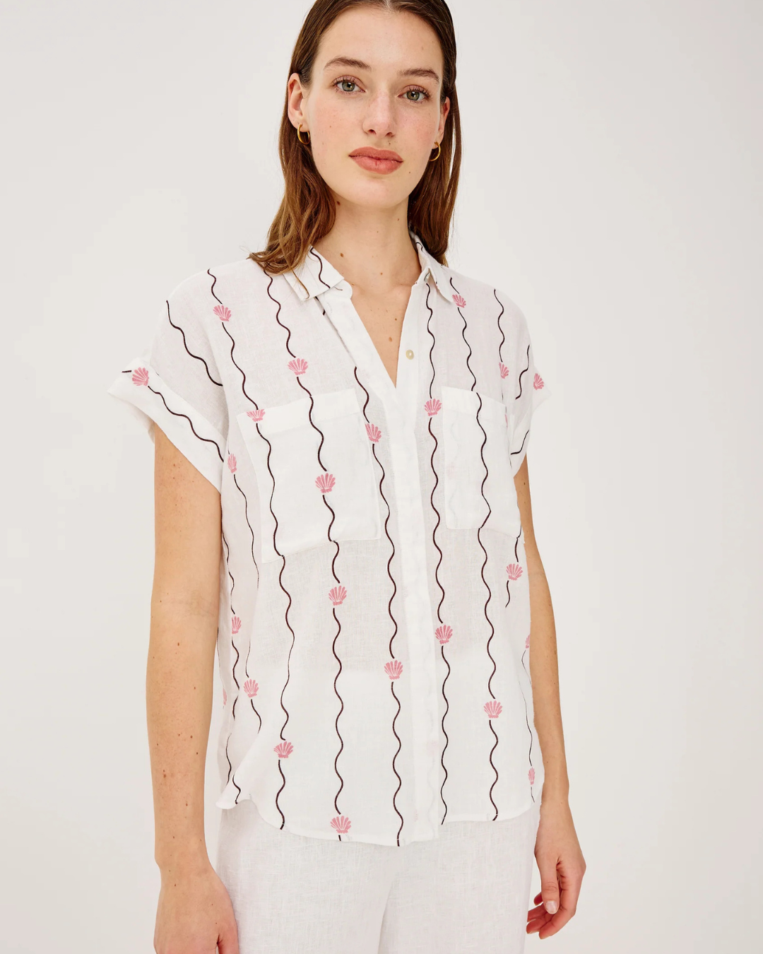 The Cito is a relaxed button-up shirt crafted from luxe linen, featuring a classic collar, chest patch pockets, cuffed cap sleeves, and an all-over seashell print.