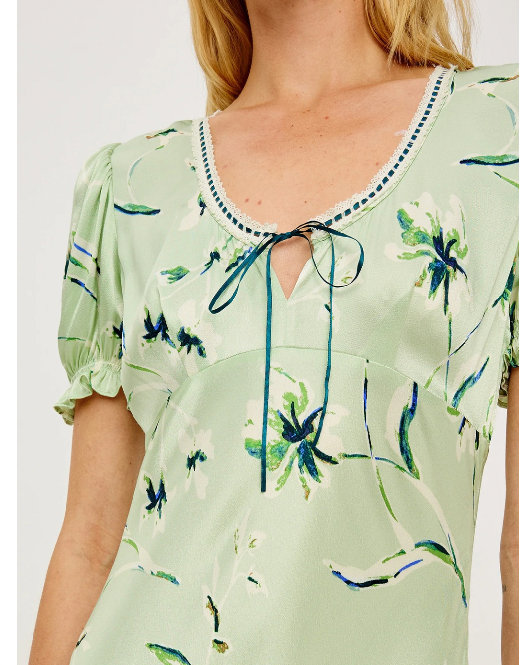 The Allison is a milkmaid-inspired maxi dress in lustrous, bias-cut satin crepe, featuring short puff sleeves, a scoop neckline with lace and ribbon trim and center-front ties, and a side-seam zipper.
