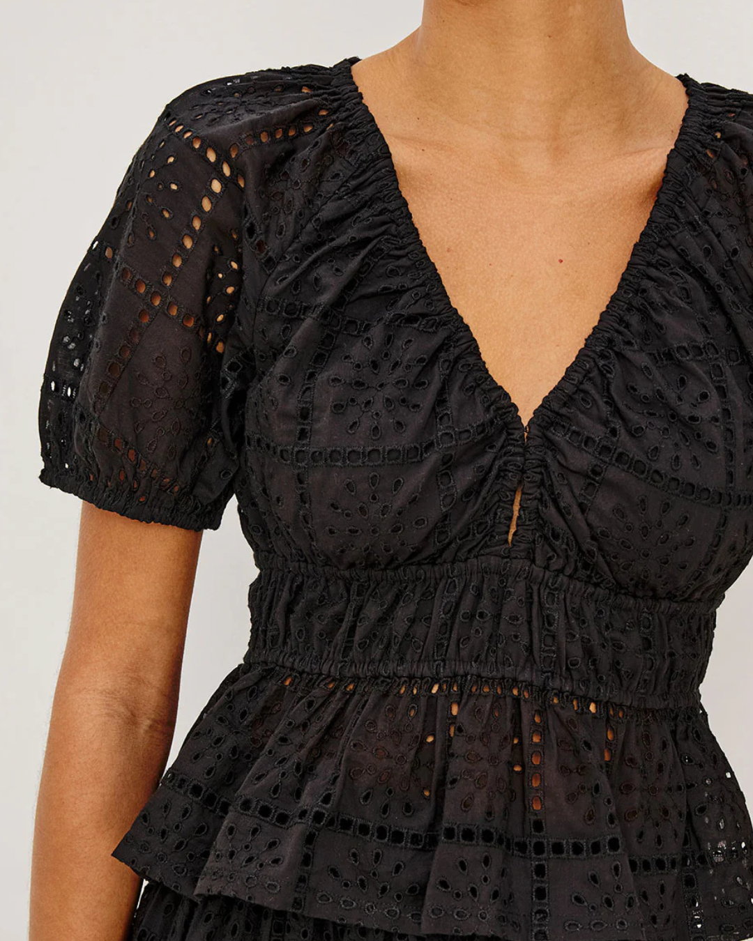 Say hello to the new Argenta Top by Rails, designed in Black Grid. Crafted from 100% Cotton, this embroidery anglaise design, features delicate openwork and cut out holes for a gorgeous, unique finish. With a V shaped neckline and short sleeves, this top features: