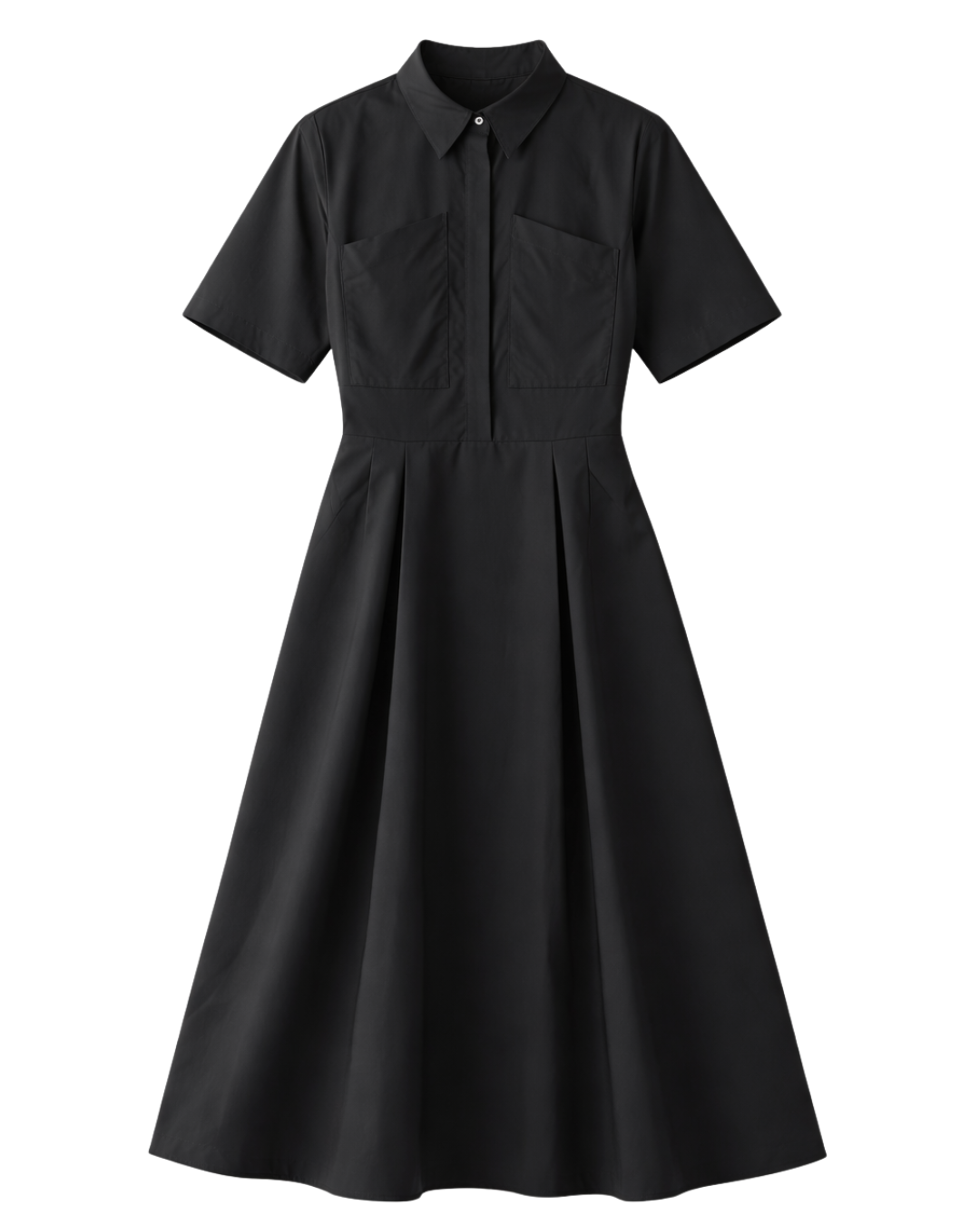 A study in modern restraint, this midi dress brings structure and softness into perfect balance. The sharp collar and extended sleeves lend a tailored precision, offset by pleats that release volume through the skirt. Angled chest pockets nod to utilitarian codes, while the concealed placket maintains a clean, uninterrupted line.