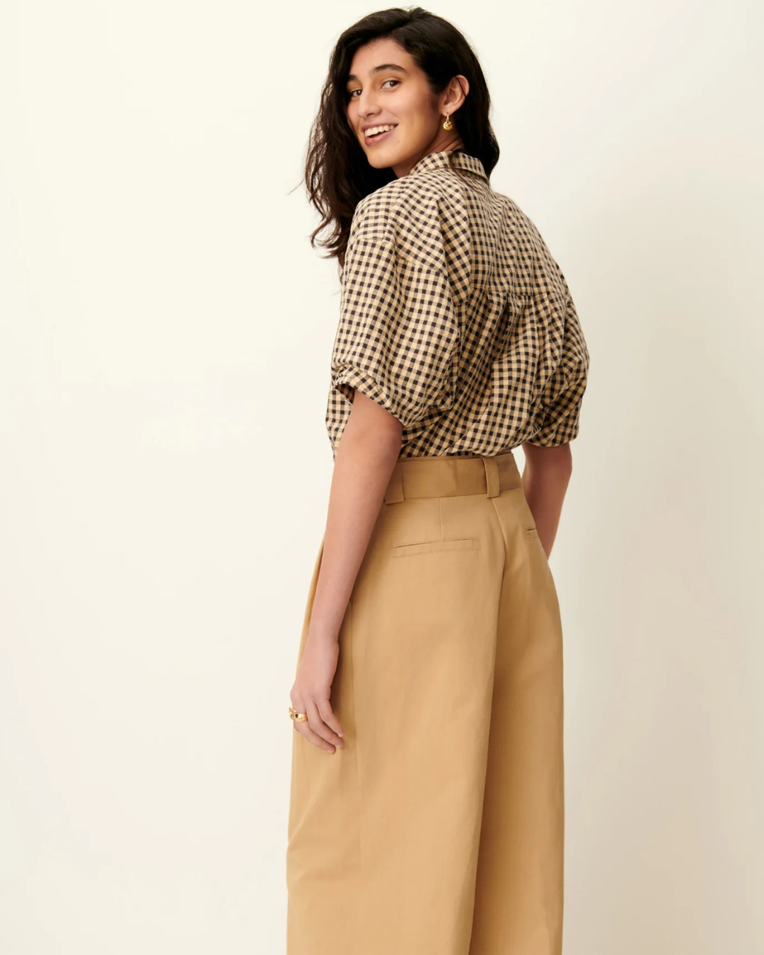 Blouse with short balloon sleeves, made from lightly textured cotton fabric with a two-toned gingham pattern, woven in Spain.