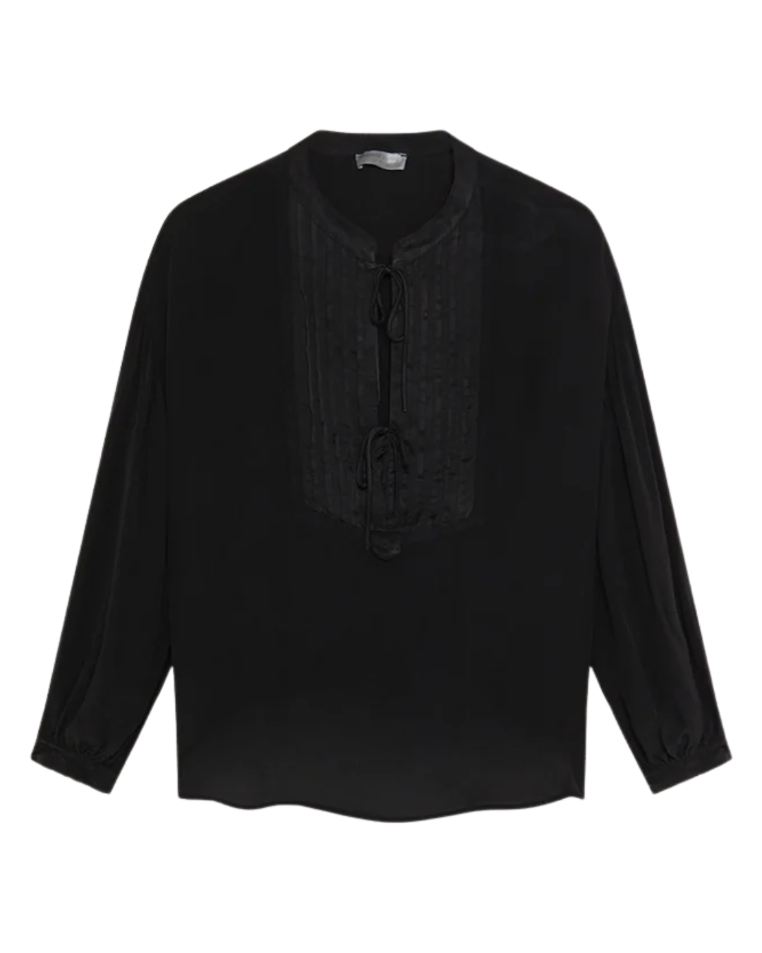 Cut in silky viscose, this blouse drapes with quiet fluidity while retaining definition through its tailored bib front. The deep black tone gives it timeless versatility, refined but strong.