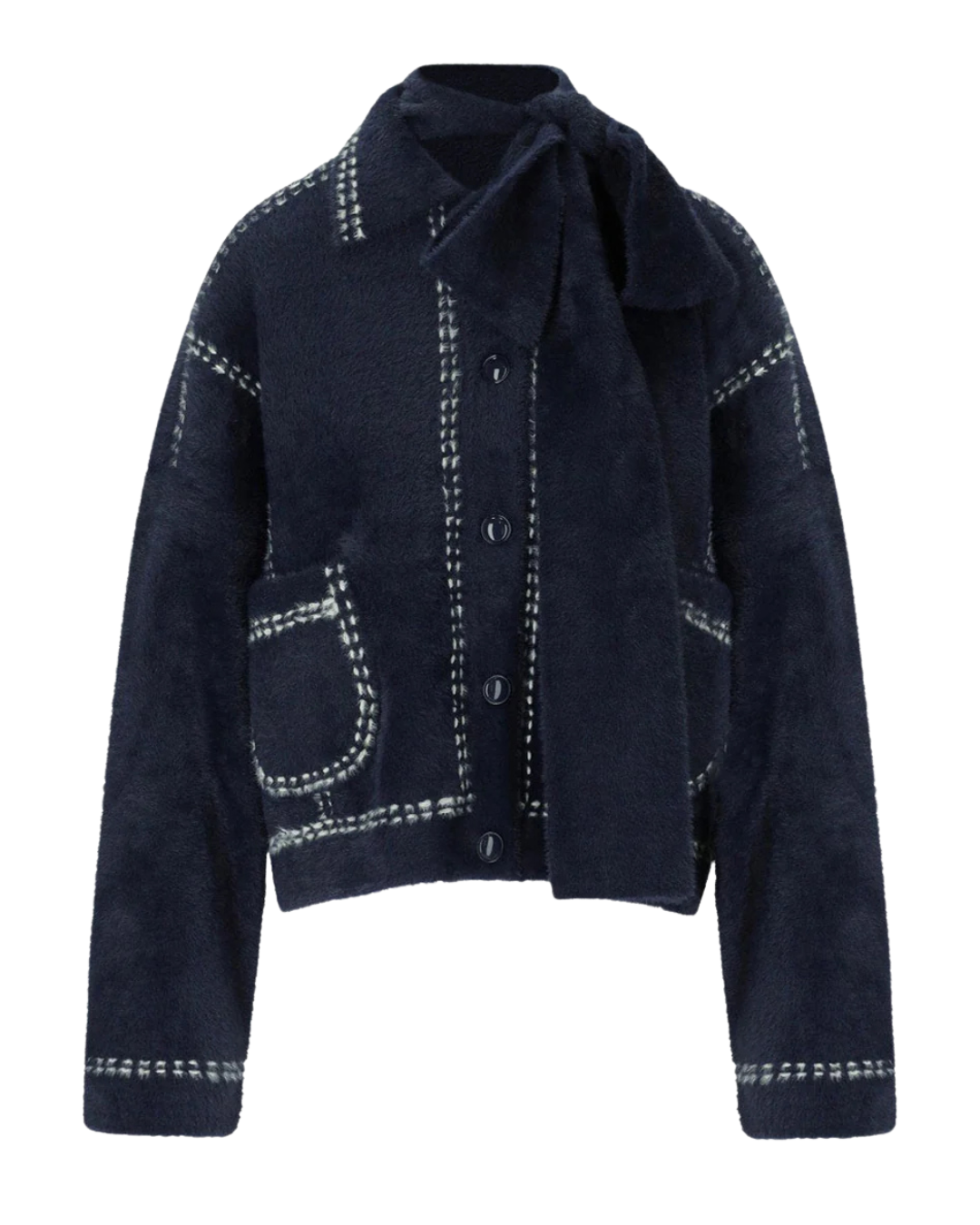 Faux fur-effect cardigan in navy blue, featuring contrasting white stitching. Patch pockets on the front, button closure, and a removable scarf that can be tied around the neck in a bow. Relaxed fit.
