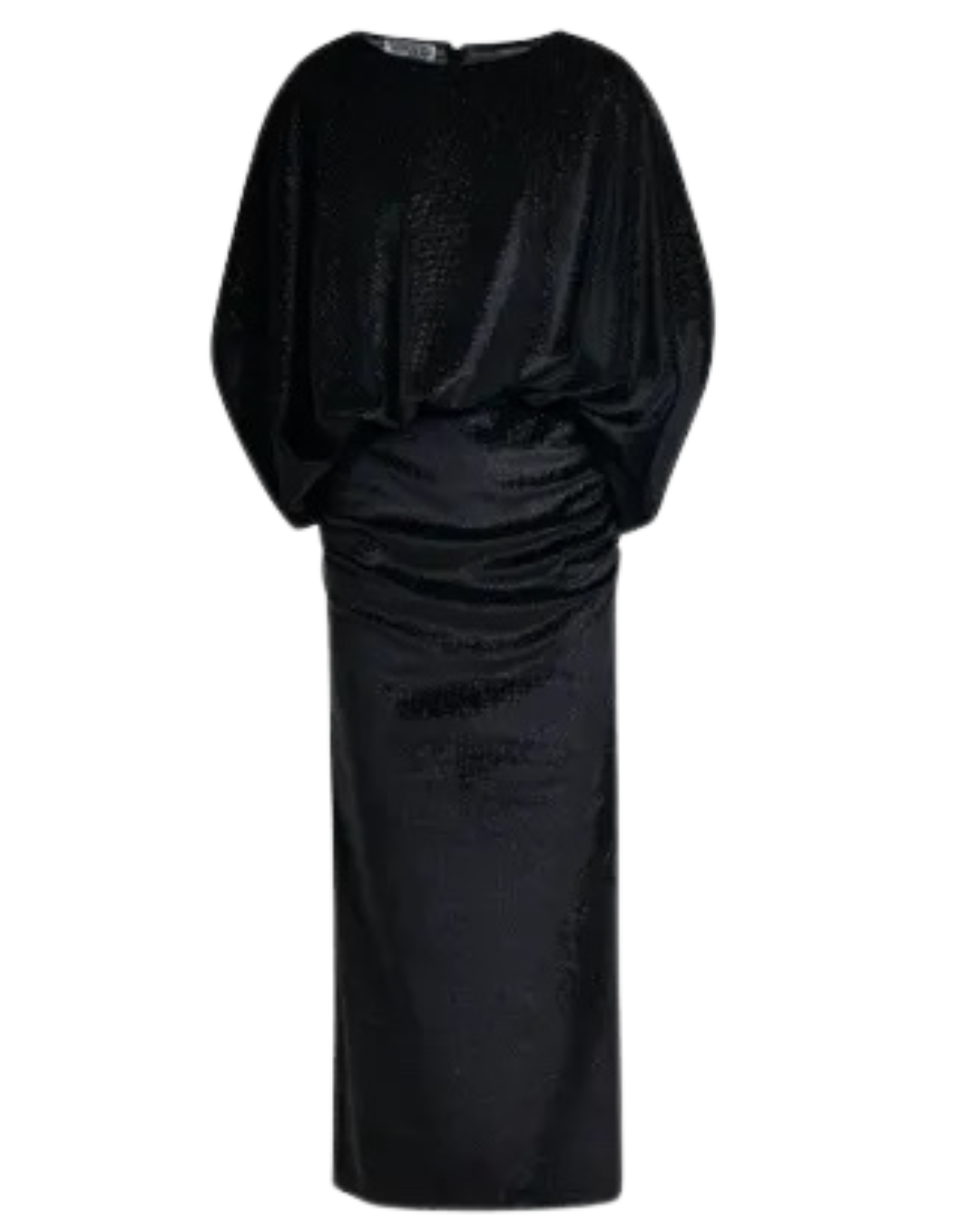 Cut from a fabric scattered with subtle sparkles, this dress elegantly accentuates the figure with a hidden elasticated waistband before falling to a maxi-length skirt. A slit introduces movement and a touch of allure. Artfully draped sleeves envelop the silhouette, flowing into a striking cape-like overlay at the back.