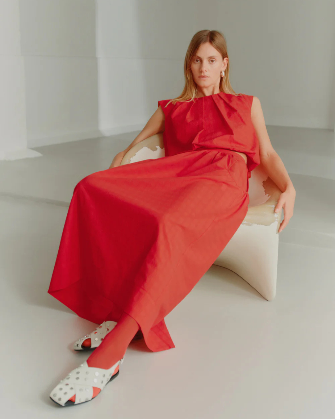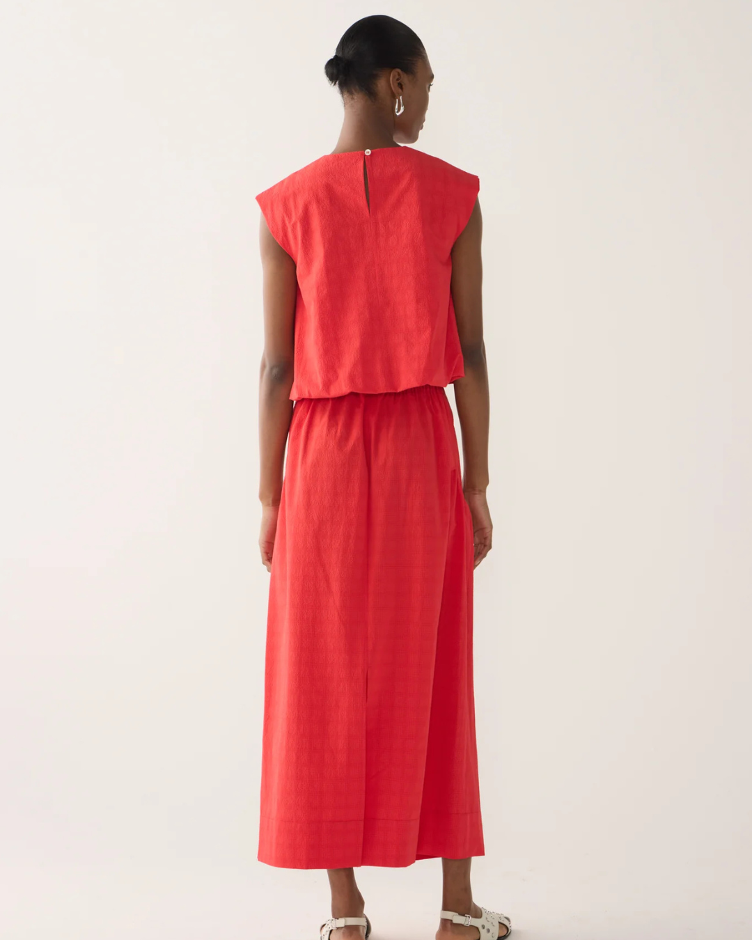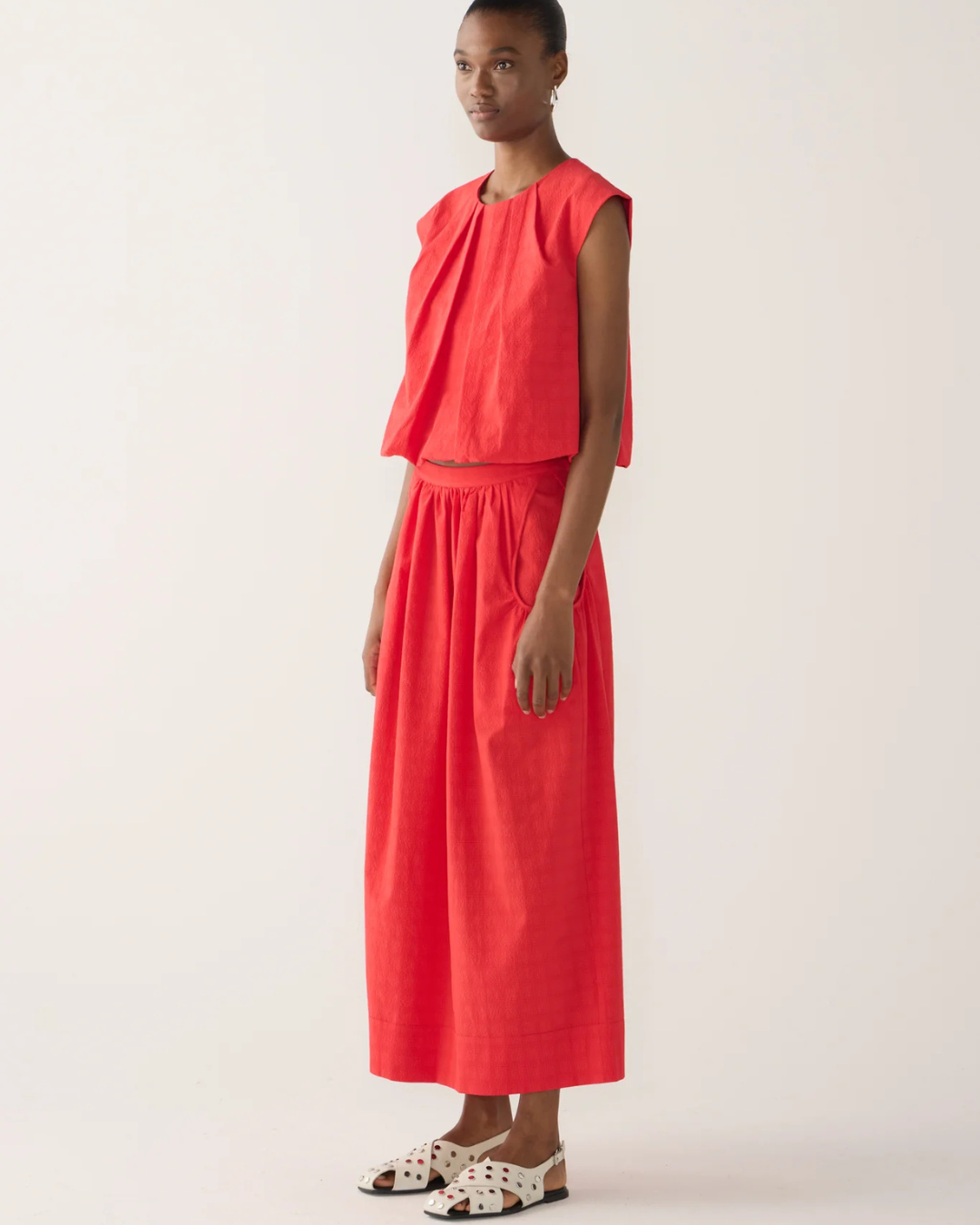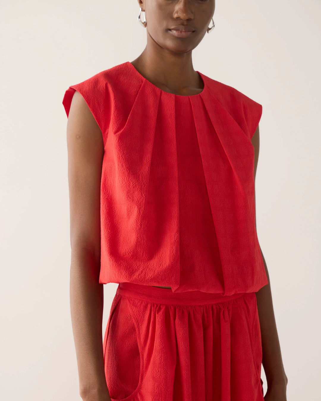 This sleeveless top is designed with soft gathers from the neckline that create gentle volume through the body. The silhouette is finished with a bubble hem that adds shape and ease, while a delicate button-and-loop closure at the back provides a refined finishing detail. Effortlessly minimal, it balances structure and fluidity.
