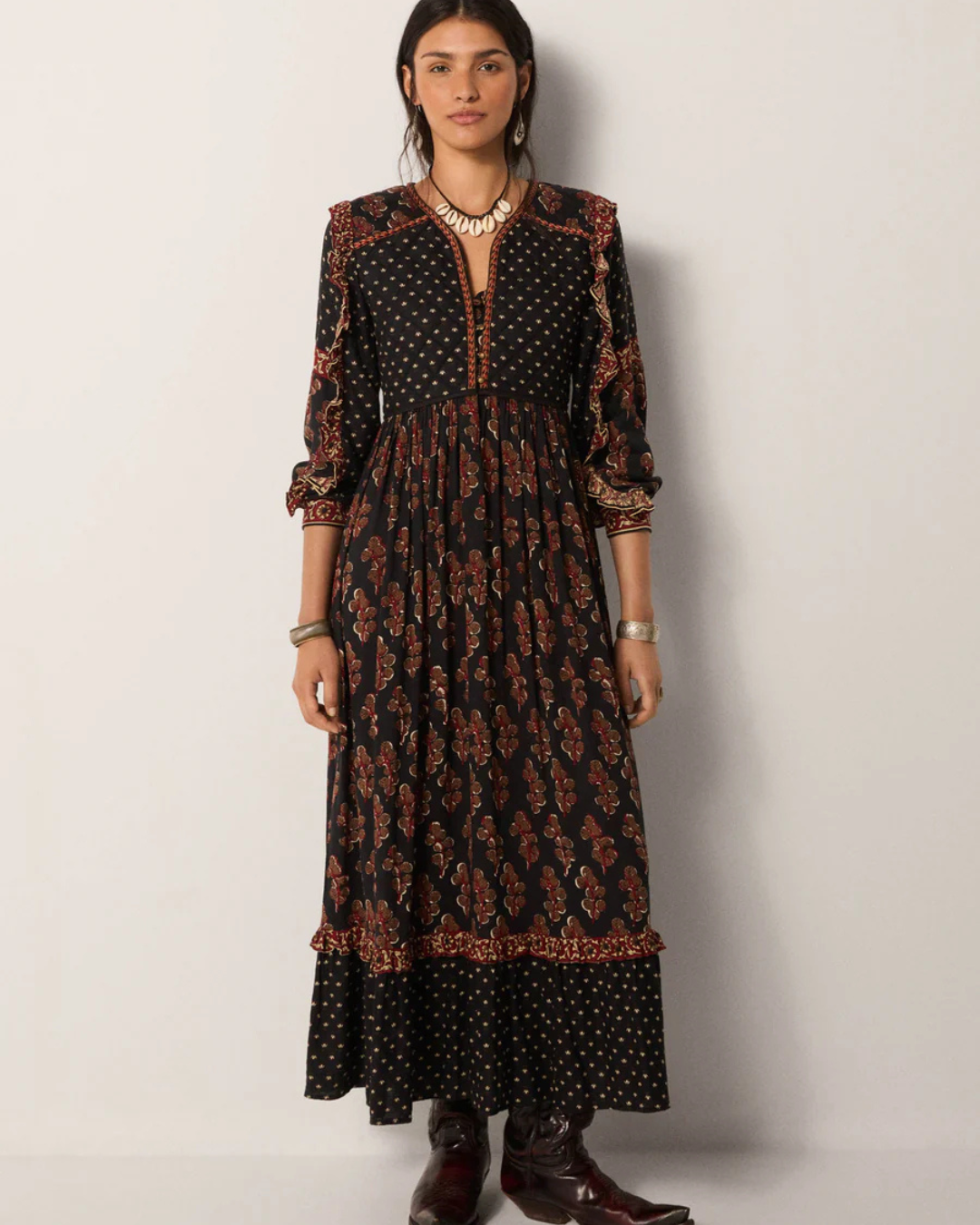 Cut in lightweight viscose dobby, the Lily Dress is where ease meets intricacy. Its flowing silhouette is fully adorned with prints that play across the dark ground, giving it movement, depth, and an unmistakable bohemian edge.