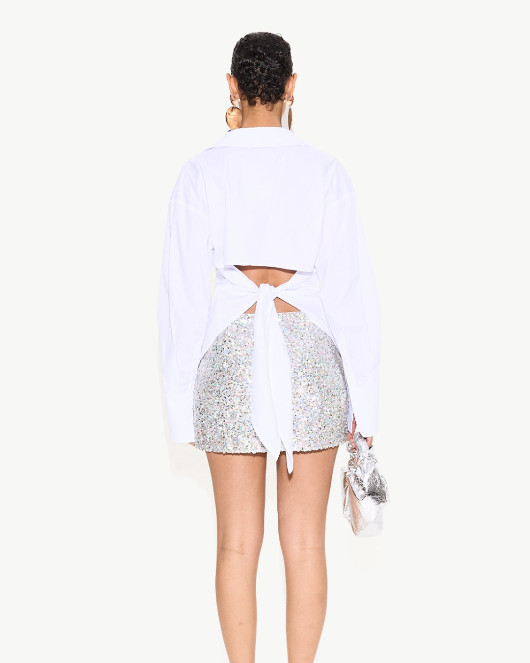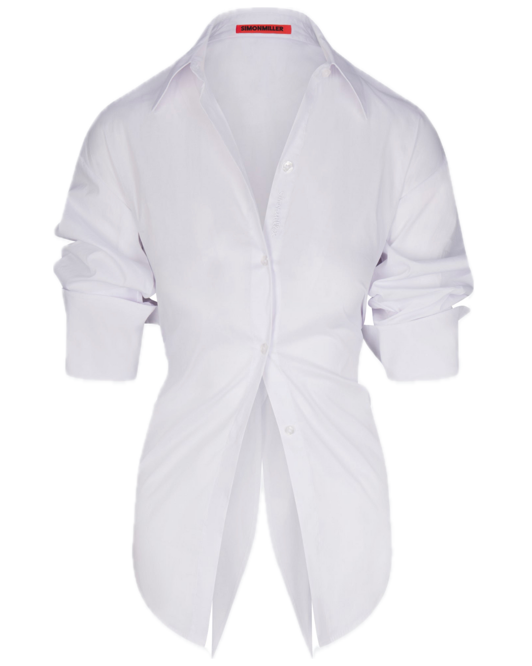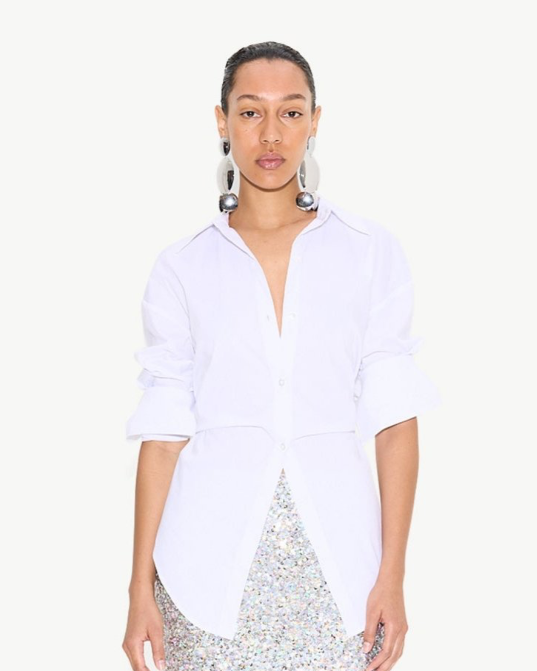 Stretch cotton poplin with cut out back and adjustable tie for fit flexibility. The ultimate versatile piece, dress up or down.