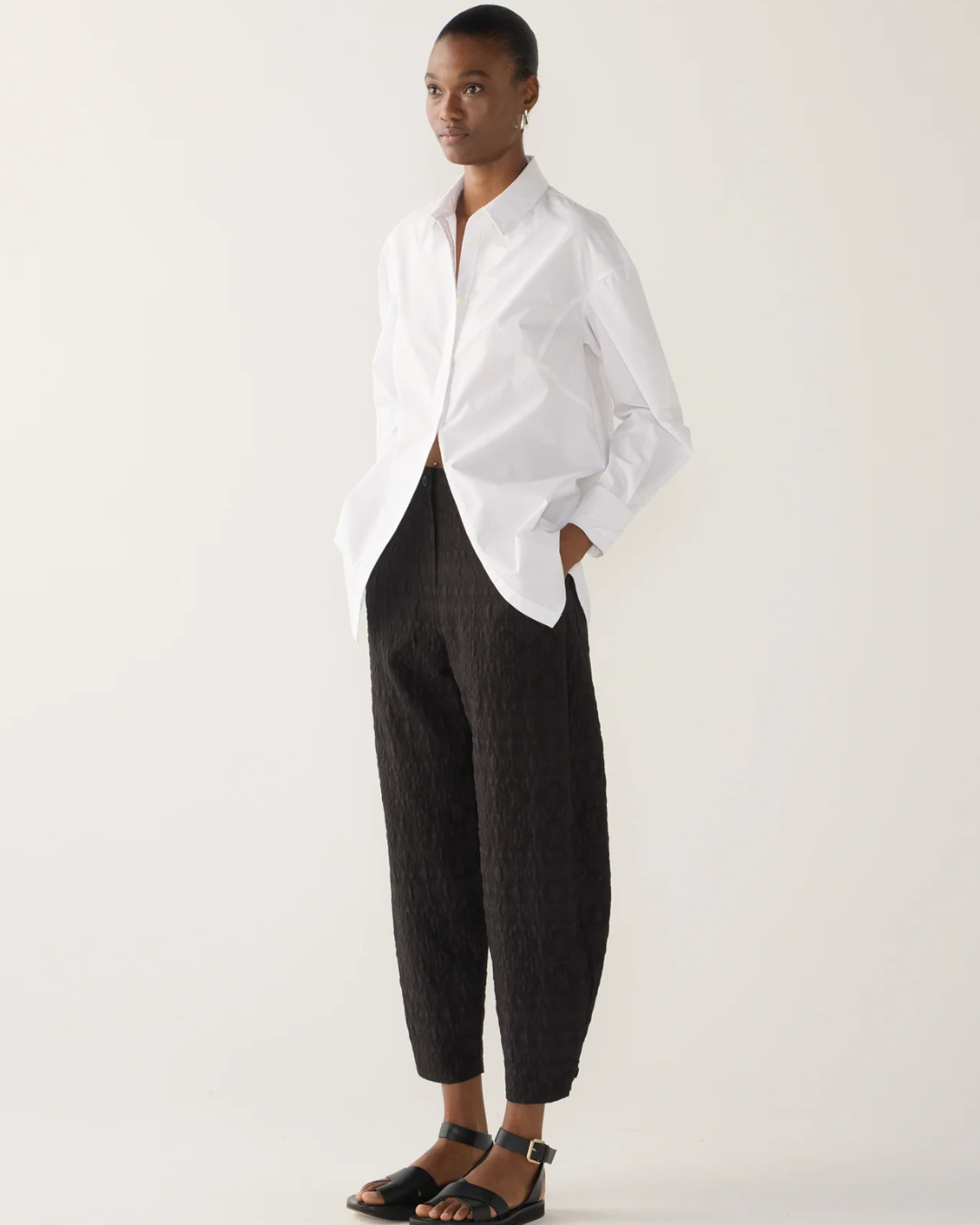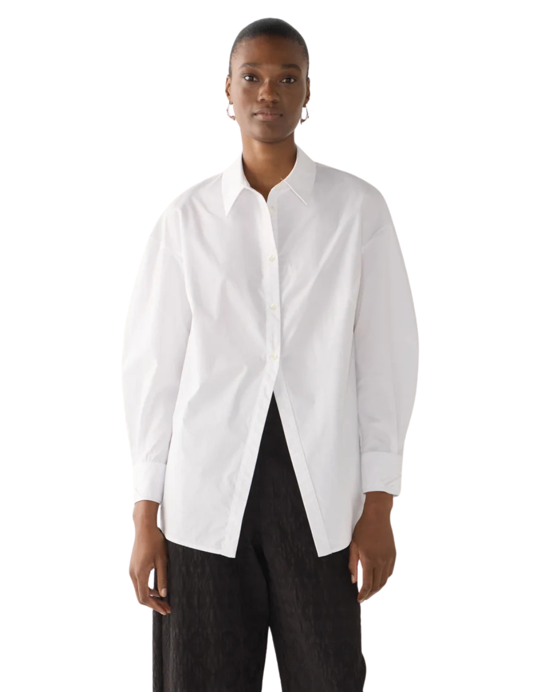 This shirt redefines the classic silhouette with refined architectural touches. Crafted from crisp organic cotton poplin, it features a clean front placket with a cut-out hem designed to create a flattering line through the body. The sleeves finish with a folded cuff detail, evoking a subtle origami-inspired structure that brings quiet sophistication to its relaxed shape. A timeless piece with modern intention.
