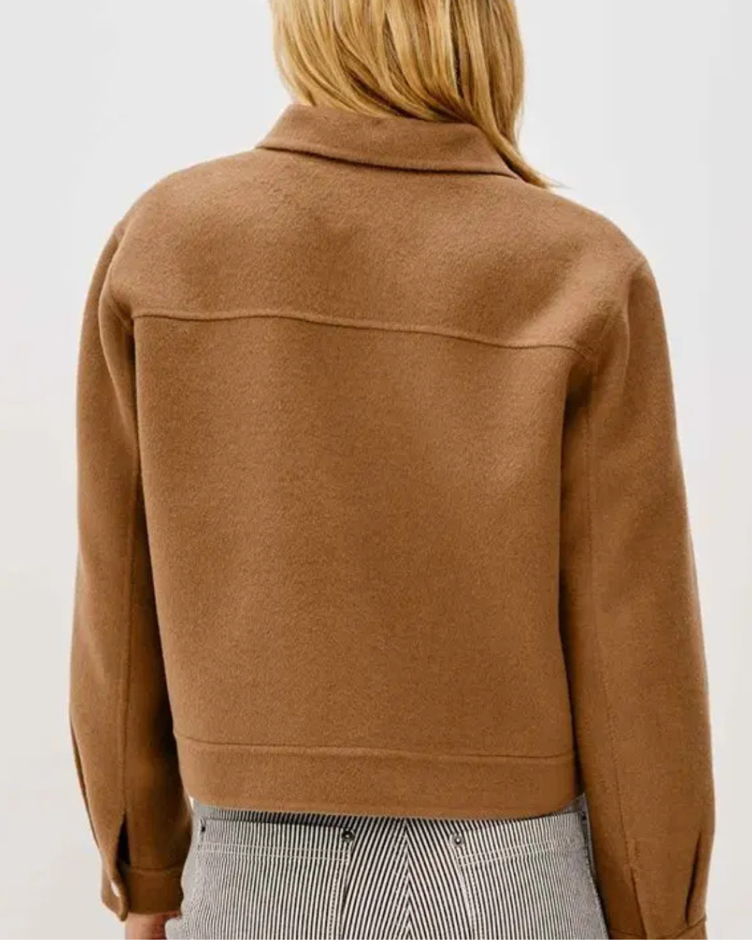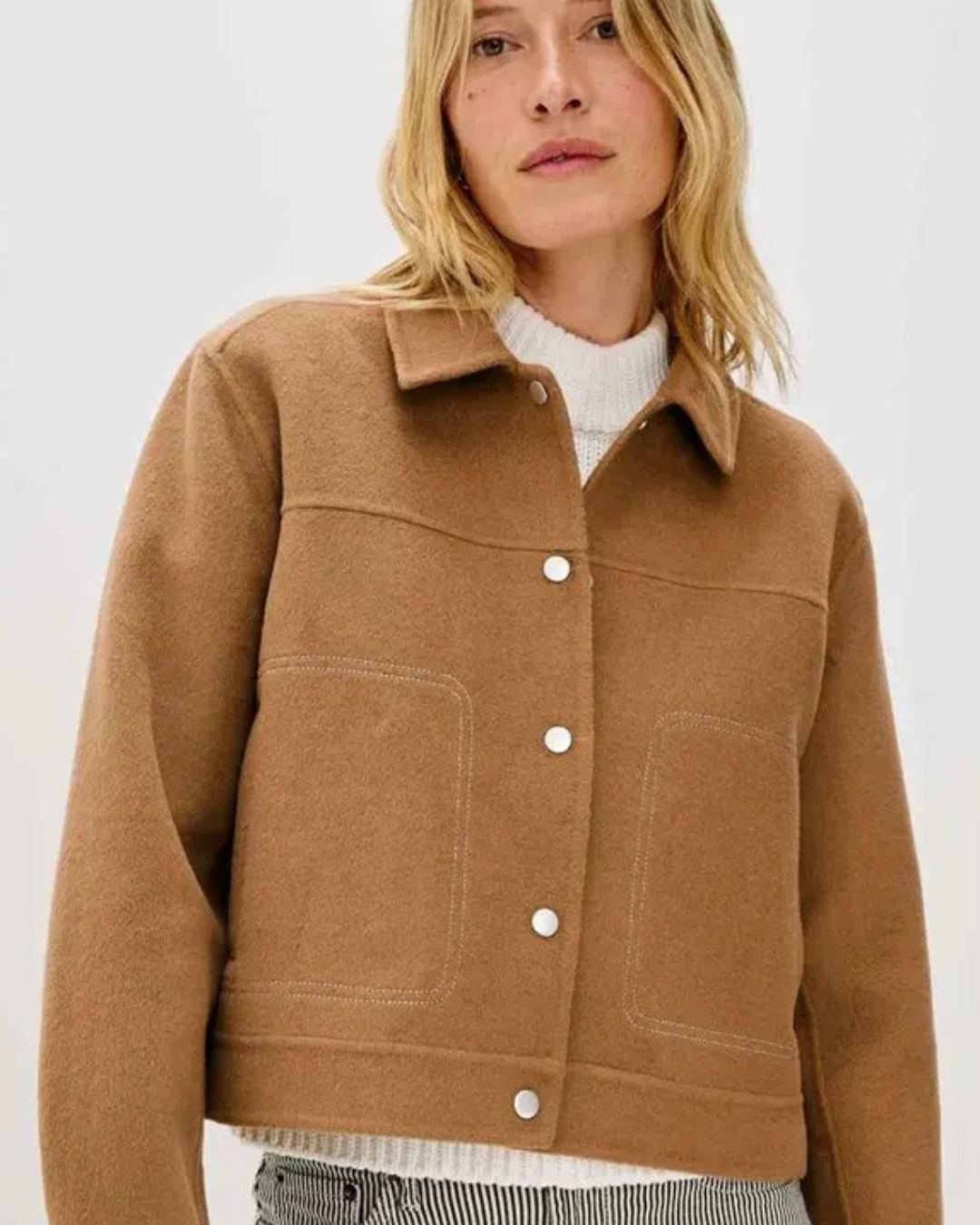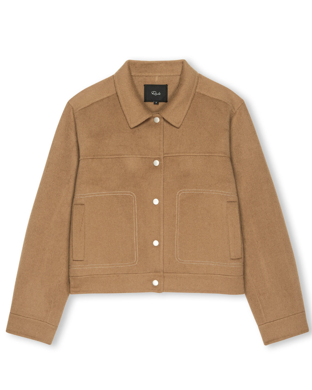 The Rails Mountain Jacket in a timeless camel shade offers a refined silhouette with its shirt-style collar and central snap closure. Designed with two side pockets and a tailored short cut, it combines practicality with understated elegance, making it a versatile addition to any wardrobe.