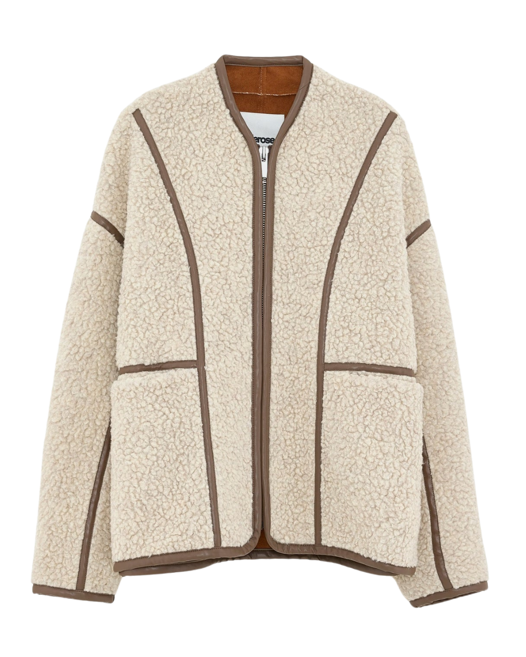 Oversized beige sherpa fleece jacket with contrast piping and a rust-coloured suede interior. It features a zip-up front, and large front pockets.