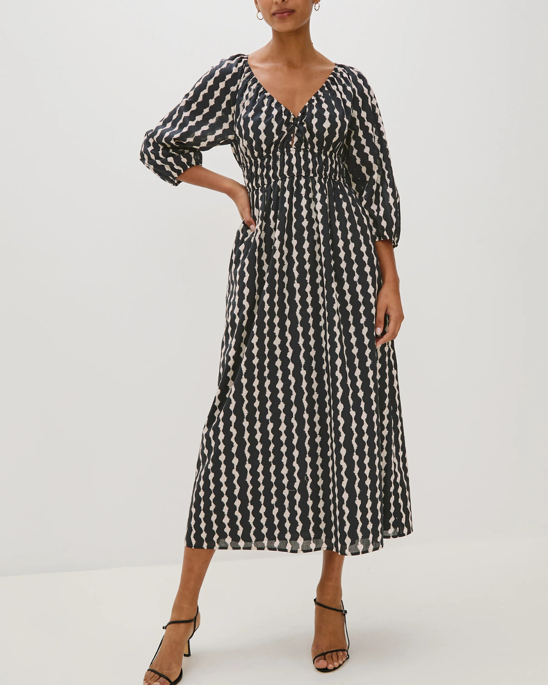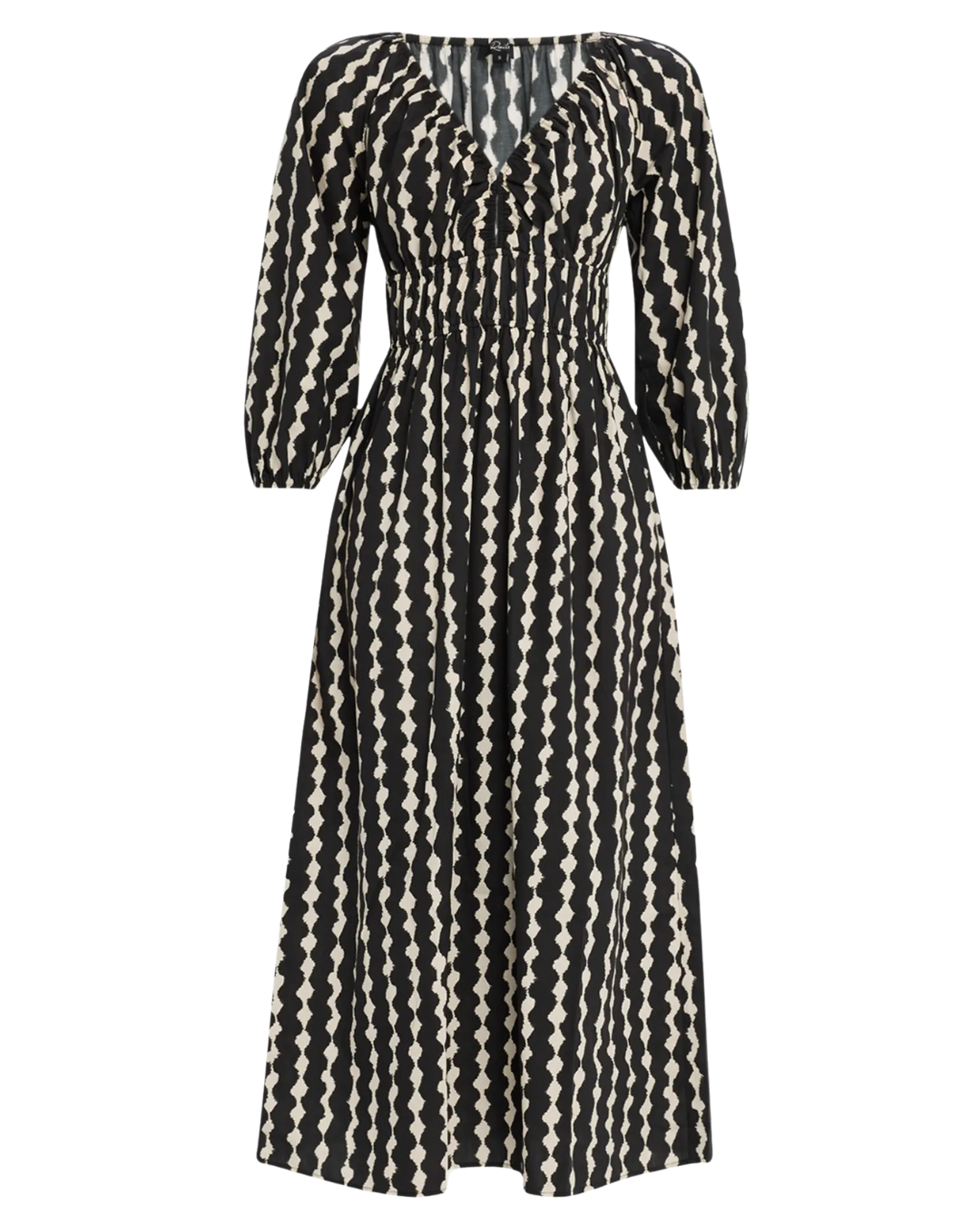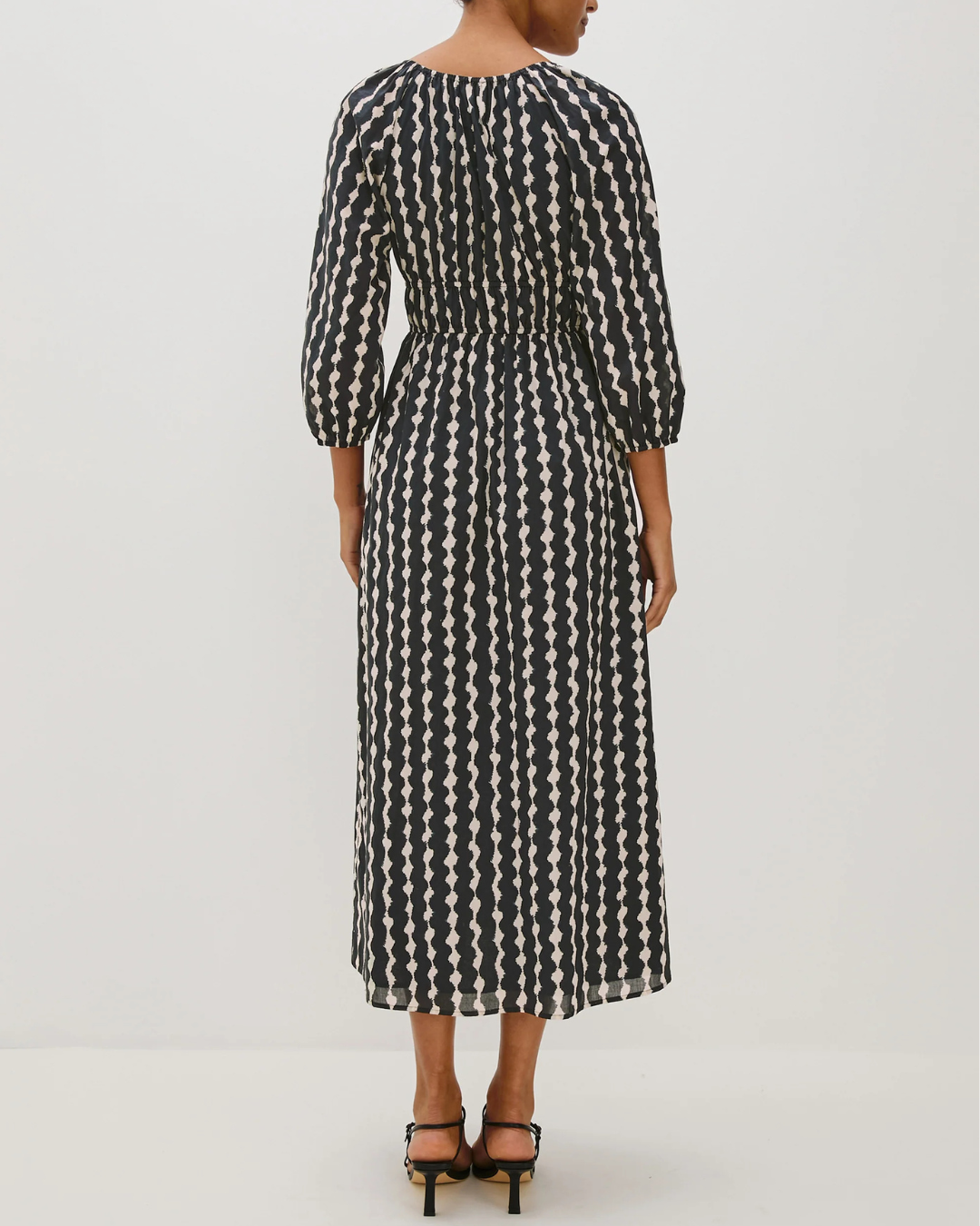 The Paio dress flatters with a fitted bodice and full-length, flowy skirt. Lightly elasticated bracelet-length sleeves and a hook-and-eye front closure offer flexibility, while full lining ensures all-day comfort.