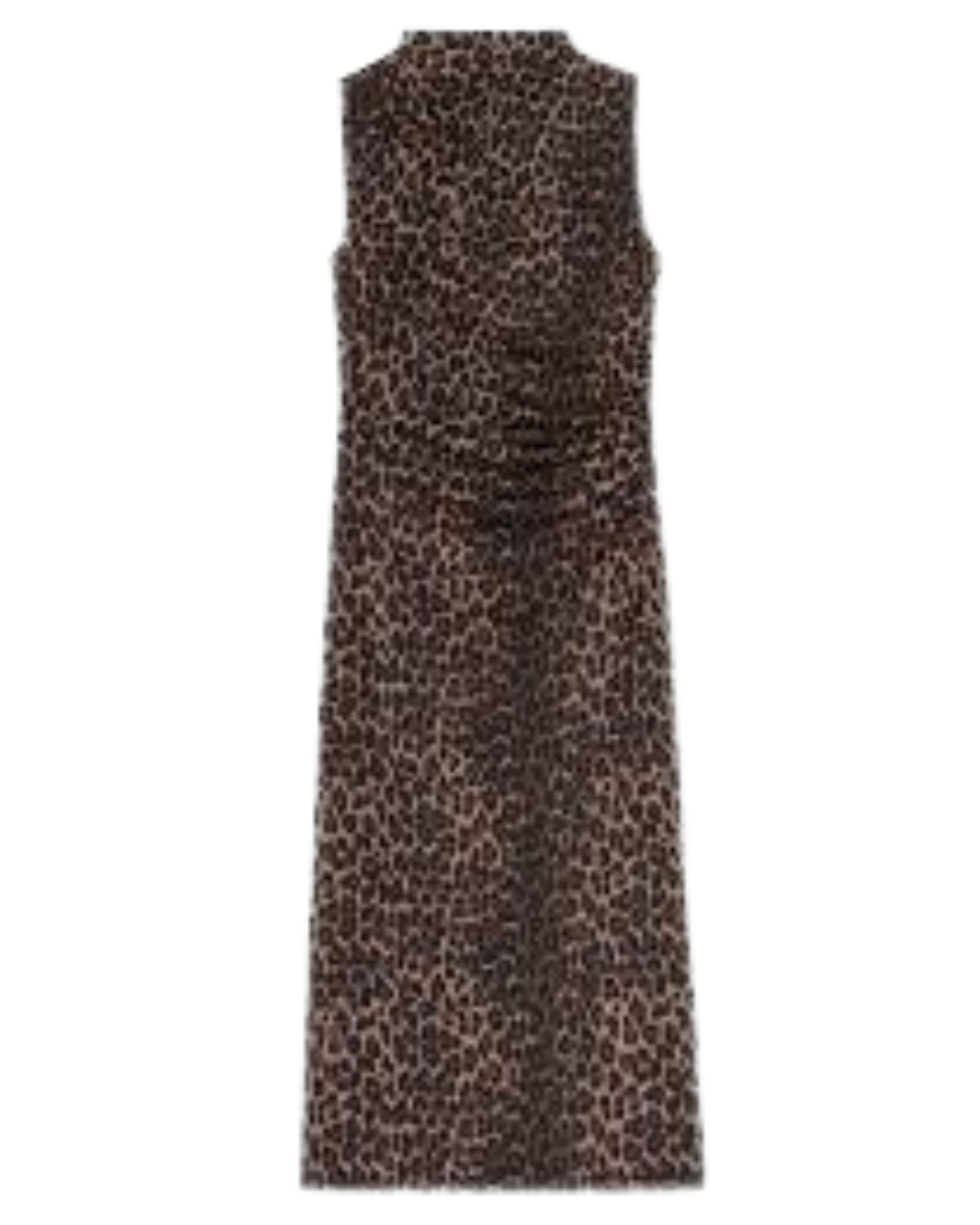 The Rebecca is a sleeveless midi dress with a sleek silhouette. A funnel neckline and ruched sides lend to its polished design.