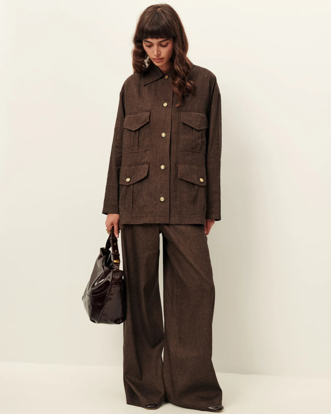 Topstitched patch pockets with rounded pleats, two of which have buttoned flaps.