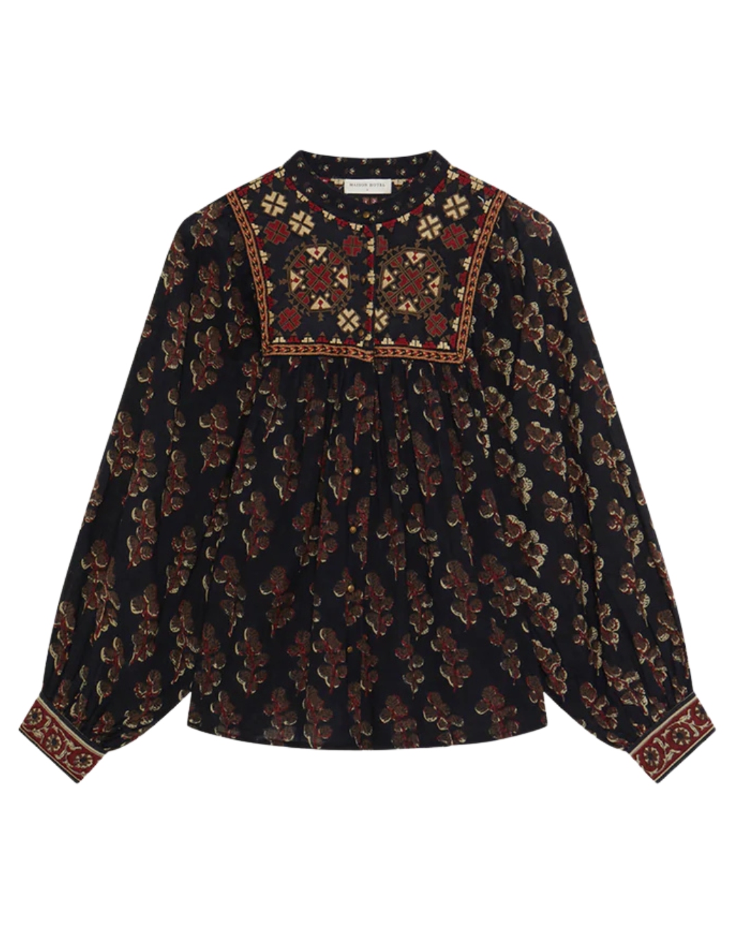 Delicate scarlet florals unfold across the surface, framed by a geometric yoke that adds contrast. Gentle gathers at the shoulders enhance the artisanal character without excess.