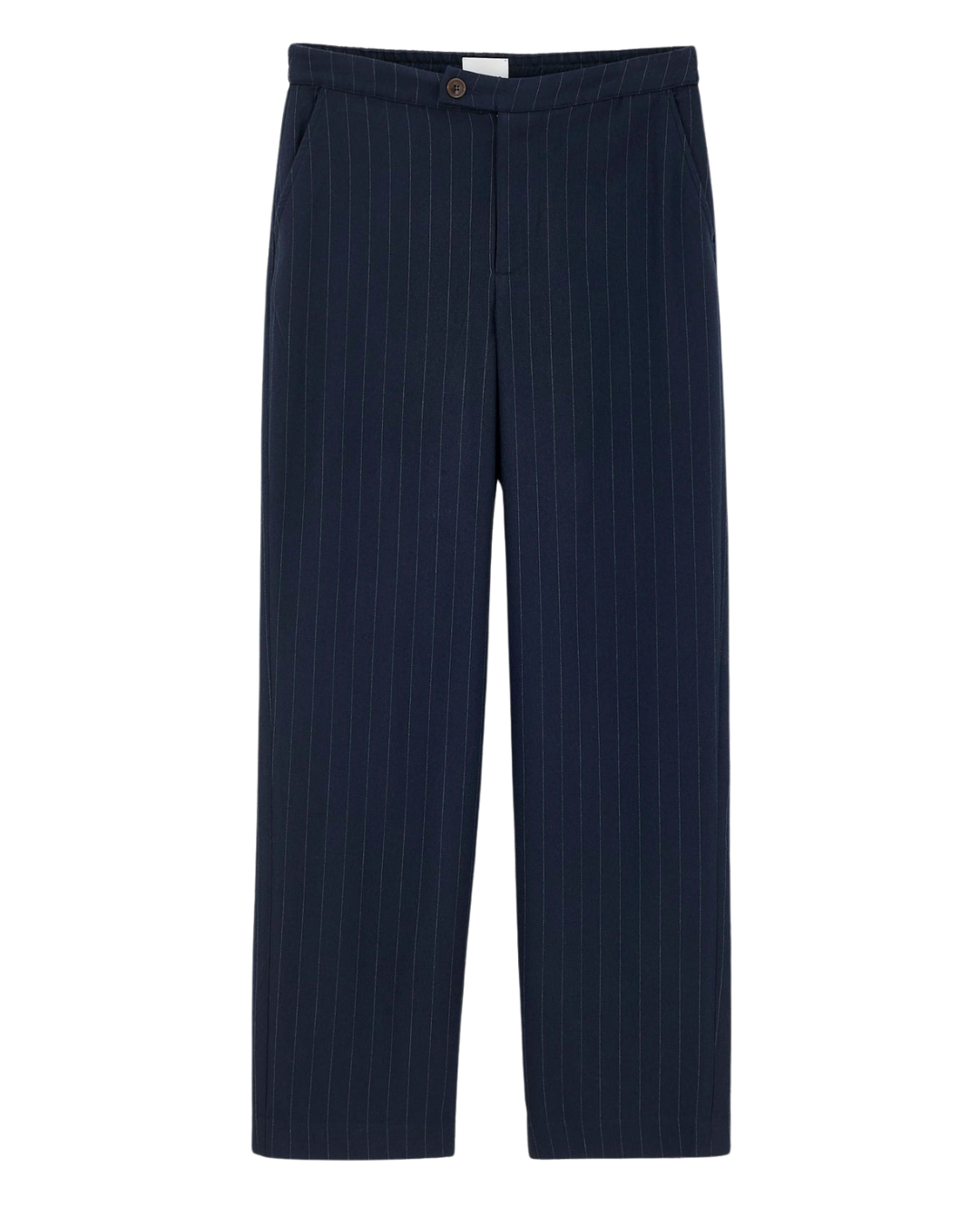 Regular pinstripe trousers in navy with an elasticated back waist and an off-center button closure.