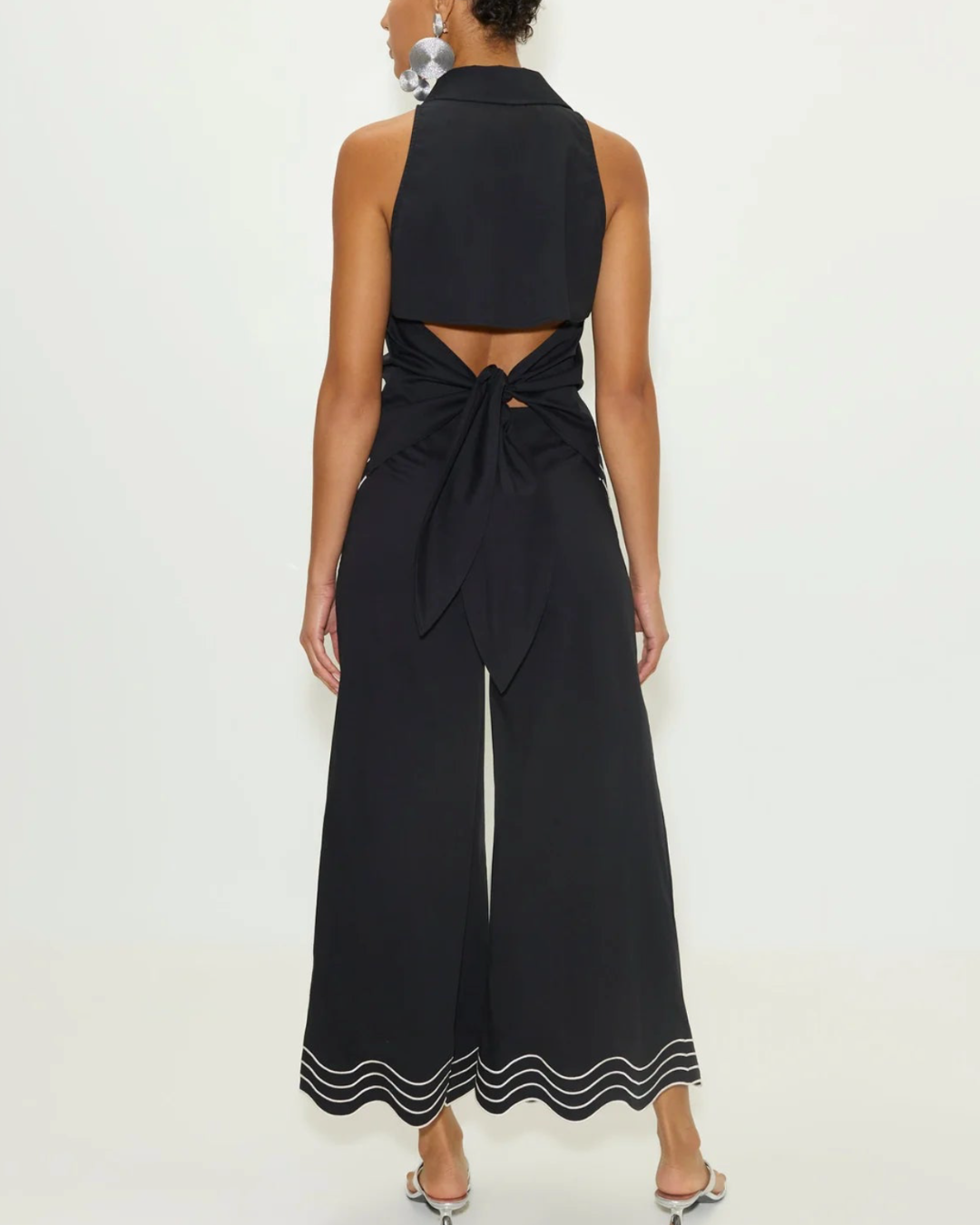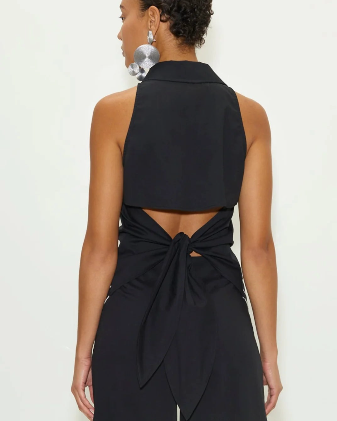 Loch now sleeveless. Stretch cotton poplin, with cut out back and adjustable tie for fit flexibility. The ultimate versatile piece, dress up or down. Wavy detailing on bottom of shirt.